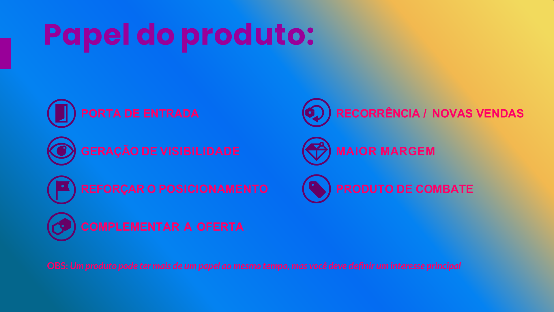 Em um portfólio com mais de um produto, cada item deve ter um papel claro. Os principais papéis são: