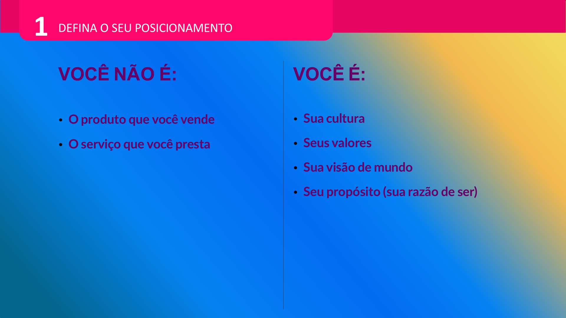 O propósito é a razão de existir da marca para além do lucro. Não é um slogan, é a motivação profunda que move o negócio.