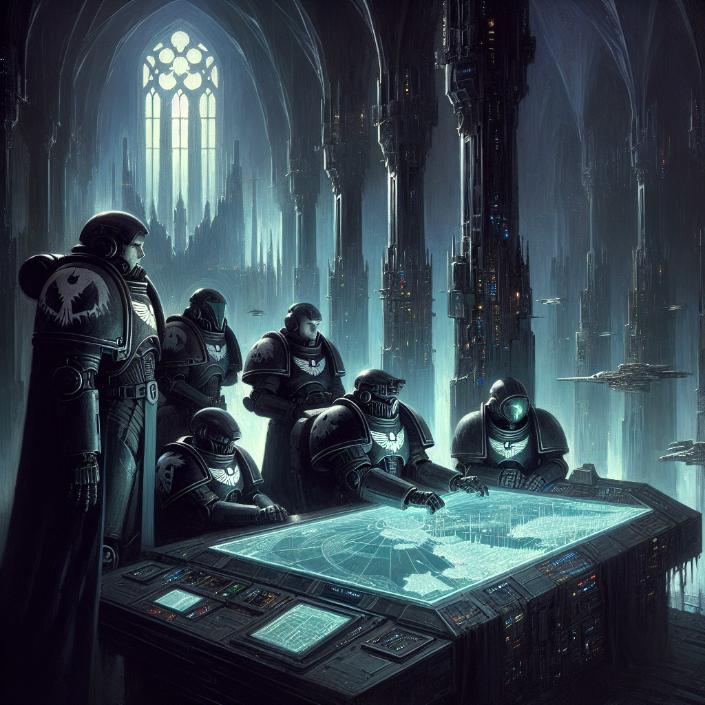 The group gives off a sense of unity and focus, with everyone’s attention directed toward the hololith, situated on what appears to be an aged, white marble table. The body language and expressions suggest a tense, collaborative atmosphere, typical of a war council in the grim darkness of the far future.